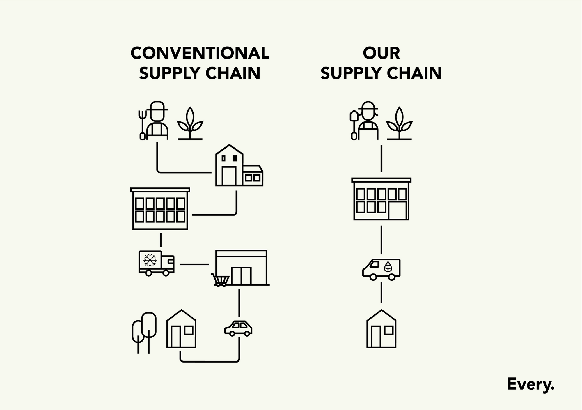 This is not your average supply chain. Ours is shorter, more transparent and more sustainable. Thanks to direct sourcing, we have a close relationship with our suppliers and can trace each ingredient. This facilitates 100% transparency from farm to fork. By cutting out middlemen, we also avoid unnecessary transport paths or wasteful re-packaging.
