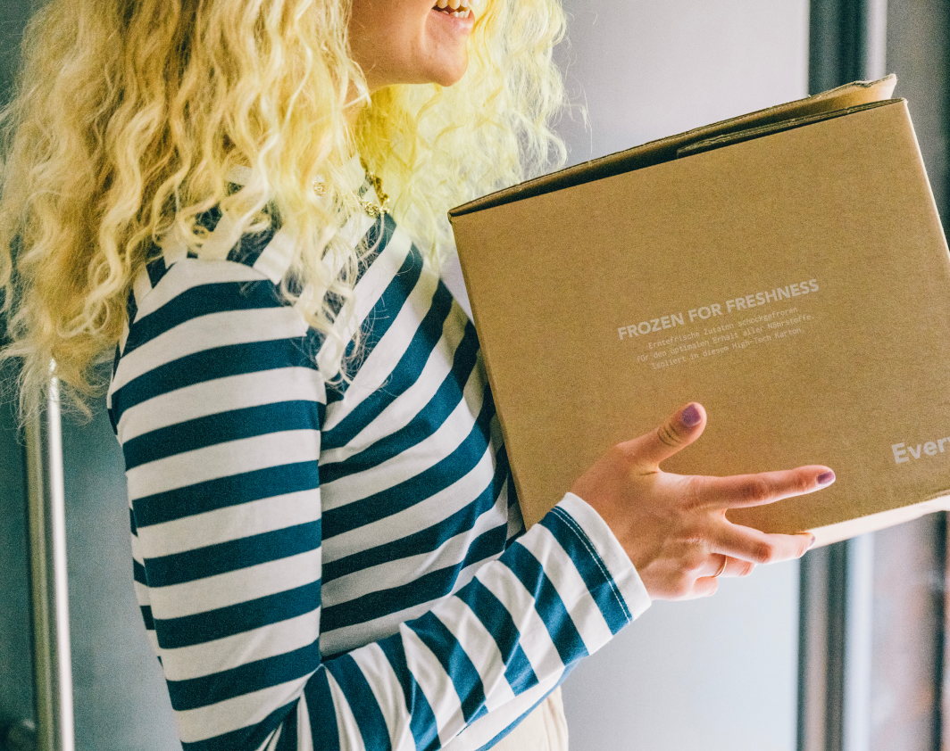 Die Verpackung unserer Produkte wurde so optimiert, dass 6-8 Boxen in das kleinste eingebaute TK-Fach in Deinem Kühlschrank passen.